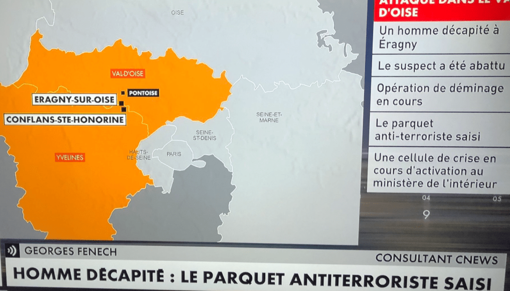 Τρομακτική σκηνή εγκλήματος στο Eragny-sur-Oise λίγο έξω από το Παρασκευή την ιερή Παρασκευή των Μουσουλμάνων προς το τέλος του απογεύματος..Ένας άνδρας αποκεφαλίστηκε μέσα στο δρόμο επί τις οδού Buisson Moineau. Οι αστυνομικοί καταδίωξαν τον επιτιθέμενο και τον εξουδετέρωσαν με σφαίρες στη λεωφόρο Roger Salengro, που είναι κάποια εκατοντάδες μέτρα όχι μακριά από το δημαρχείο της Conflans-Sainte-Honorine (Yvelines).