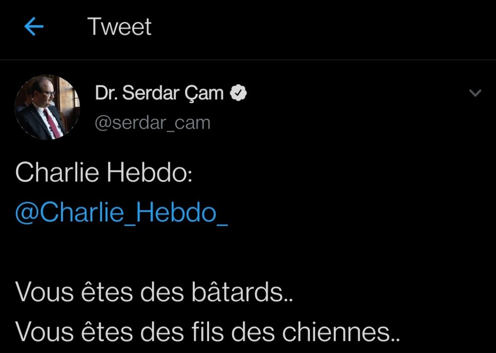 ”Είστε μπάσταρδοι είστε γιοι σκύλας” ήταν η απάντηση του Αναπληρωτή Υπουργού Πολιτισμού και Τουρισμού της Τουρκίας Serdar Cam-φανταστείτε να μην ήταν και Πολιτισμού τι θα έλεγε- στο Charlie Hebdo για την πιπεράτη καρικατούρα του λυσσάρη Ερντογάν που κοσμεί το αυριανό εξώφυλλο του περιοδικού..Στα άκρα….