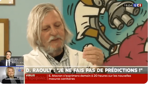 Χθες Τρίτη στην αρχή της βραδιάς ο δημοσιογράφος David Pujadas πήρε συνέντευξη από τον διάσημο Καθηγητή Λοιμωξιολογίας Didier Raoult Διευθυντή του (IHU) Méditerranée Infection στη Μασσαλία που μεταδόθηκε από το κανάλι LCI. « Δεν θέλω να φοβίσω τ΄άτομα, δεν μανιπουλάρω το φόβο για να φοβίσω τον κόσμο (…) Θεωρώ ότι αυτή η χώρα ζει ένα δραματικό λάθος που είναι η διαρκής δραματοποίηση (…) »« Τελικά τι θα προτείνουμε; Όλος ο κόσμος να μείνει κλεισμένος σ΄όλη του τη ζωή γιατί έξω κυκλοφορούν ιοί; Είστε όλοι τρελοί. Το χάσατε όλοι.. » τόνισε ο Didier Raoult.