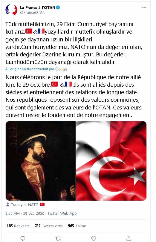 Ωστόσο πιο σοκαριστική όσο και διαφωτιστική είναι η ανάρτηση της γαλλικής αντιπροσωπείας στο ΝΑΤΟ για την Τουρκία σήμερα μετά το μακελειό.