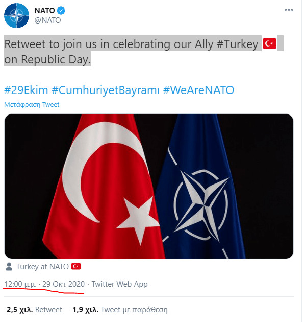 Προκαλεί το ΝΑΤΟ προσφέρει στήριξη στον Σύμμαχό του Ερντογάν την πιο κρίσιμη στιγμή ενώ ακόμη δεν είχαν μαζέψει τα κεφάλια στη Νίκαια από τηνε πίθεση στο καθεδρικό όπου από τζιχαντιστή αποκεφαλίστηκαν 2 άτομα και σκοτώθηκε ένα τρίτο ”Κάνετε Retweet για να προστεθείτε μαζί μας στον εορτασμό της Συμμάχου μας Τουρκίας για την Ημέρα της Δημοκρατίας..” Αναφέρει το ΝΑΤΟ στον επίσημο λογαριασμό του 2 ώρες μετά τους αποκεφαλισμούς που ζήτησε ο Σουλτάνος..
