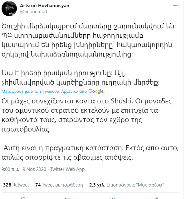 Η τελευταία ανάρτηση του Υπ.Άμυνας Αρμενίας μέσω του Στρατού του Αρτσάχ την μέρα της υπογραφής πριν την υπογραφή στις 9/11/20 ”Απωθήθηκε η επίθεση στο Σουσί….”