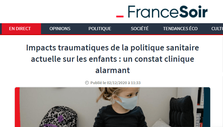 Πρωτοδημοσιεύθηκε στη francesoir στις 2/12/20 μια κλινική μελέτη με τίτλο:Τραυματικές επιπτώσεις της τρέχουσας υγειονομικής πολιτικής στα παιδιά…Μια πλειάδα Γάλλων Ψυχολόγων, Παιδοψυχιάτρων και Ψυχολόγων καταγγέλει σε ομαδική ανοιχτή επιστολή: