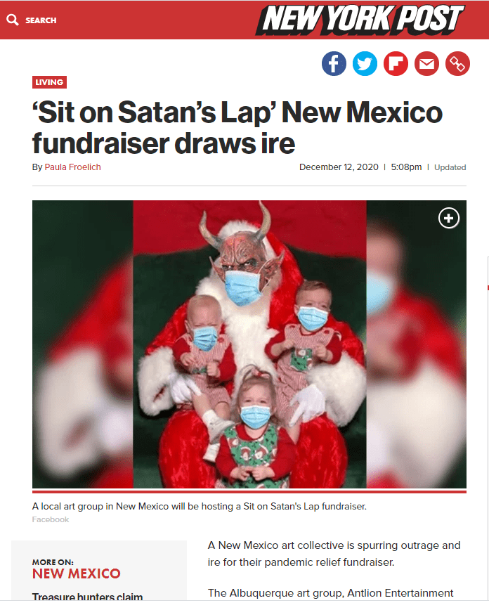Σε χώρο του Πανεπιστημίου του Νέου Μεξικού στις ΗΠΑ διοργανώνεται φιλανθρωπικό event για covid19 με τίτλο ”Sit on Satan’s Lap” ( κάτσε στα γόνατα του Σατανά).Ο διοργανωτής αυτοαπκαλείται Σατανάς και περιμένει τα παιδιά.Το διαφημιστικό σλόγκαν είναι: «Πόσα άτομα έχουν σωθεί με προσευχή; Μηδέν. Πόσα έχουν σωθεί φορώντας μάσκα; 130.000!”Στο Νέο Μεξικό μια καλλιτεχνική συλλογικότητα προκαλεί οργή και θλίψη με την πρωτοβουλία της να πραγματοποιήσει έναν έρανο προς ανακούφιση από την πανδημία.Μια τοπική καλλιτεχνική ομάδα στο Νέο Μεξικό θα φιλοξενήσει έναν έρανο ”Sit on Satan’s Lap”.