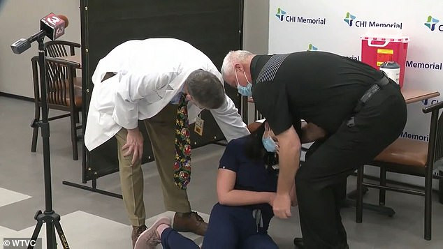 Στο νοσοκομείο CHI Memorial στην Chattanooga (ή μήπως ”Satan-ooga”) στο Tennessee η Tiffany Dover, μια Προϊσταμένη των νοσηλευτριών του Catholic Health Initiatives (CHI) Memorial Hospital λιποθύμησε αφότου εμβολιάστηκε με Pfizer-BioNTech COVID-19 μπροστά στις κάμερες σύμφωνα με βίντεο του WTVC-TV NewsChannel 9 και του WRCBtv 3 here .