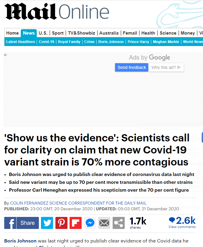 Βρετανοί Επιστήμονες και βουλευτές ρωτούν πού είναι τα αποδεικτικά στοιχεία ότι είναι 70% πιο μεταδοτικός το νέο στέλεχος του COVID η μετάλλαξή του;