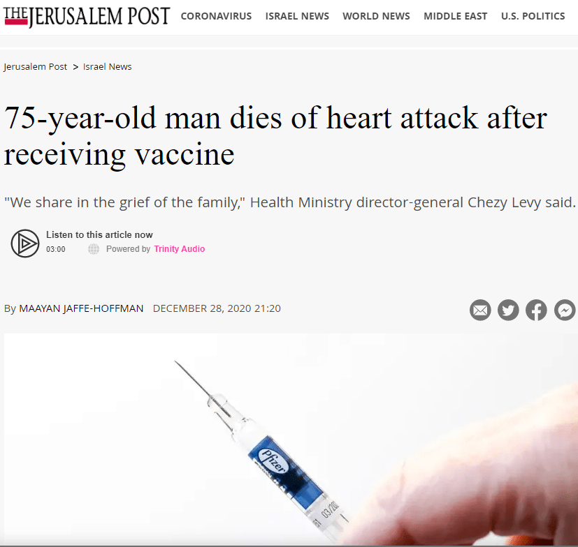Το υπουργείο Υγείας δήλωσε ”ένας 75χρονος άνδρας από το βόρειο τμήμα της χώρας που πάσχει από ενεργή καρδιακή νόσο και κακοήθη νόσο, ο οποίος έχει υποστεί πολλές καρδιακές προσβολές, εμβολιάστηκε σήμερα το πρωί κατά του κορωνοϊού και πέθανε στο σπίτι λίγο μετά η διαδικασία.” (σσ.Γιατί εμβολιάστηκε τότε αφού είχε τόσο επιβαρυμένο ιστορικό και σε τι εξυπηρετεί η λήψη αυτού του ιστορικού αν όχι για να προστατεύει τους ασθενείς; Αυτό το ιστορικό δε αποτελούσε αντένδειξη;)
