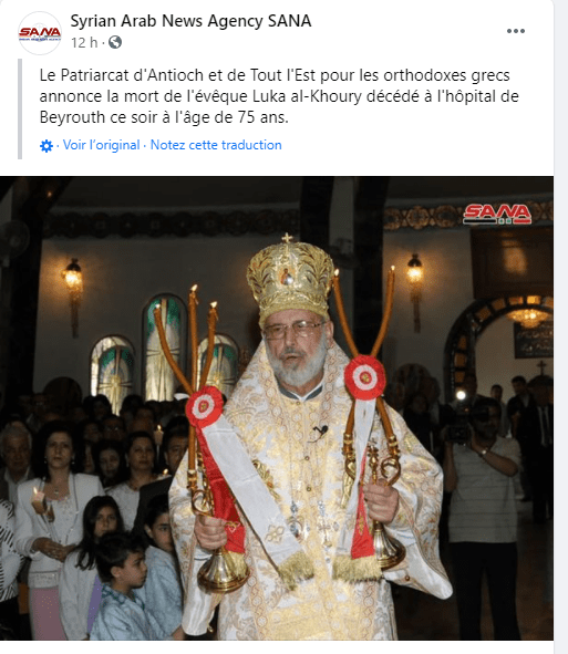 To πρακτορείο SANA ανακοίνωσε: o πατριάρχης Αντιοχείας και πάσης Ανατολής για τους ελληνορθόδοξους ανακοινώνει το θάνατο του επισκόπου Luka al-Khoury που πέθανε σε νοσοκομείο της Beyrouth αυτό το βράδυ σε ηλικία 75 ετών.