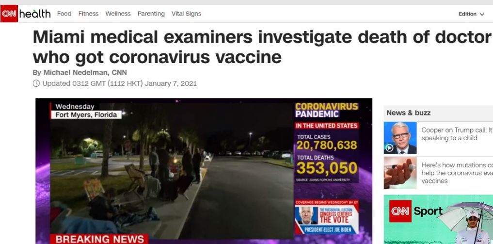 Στο Μαϊάμι, ο 56χρονος μαιευτήρας / γυναικολόγος Dr Michael, χωρίς υποκείμενο νόσημα εμβολιάστηκε με Pfizer στις 19/12/20. Πέθανε στις 3 προς 4 Ιανουαρίου 2 εβδομάδες μετά τον εμβολιασμό του.