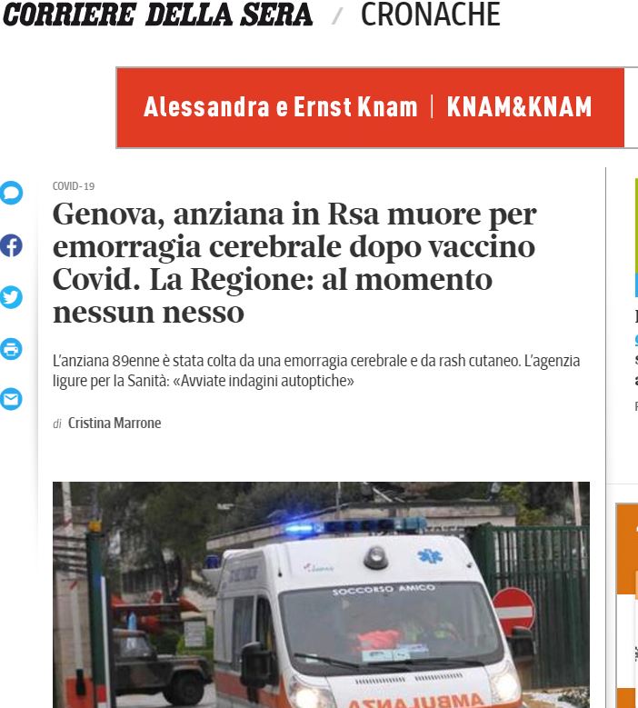 Στη Γένοβα, μια ηλικιωμένη γυναίκα σε RSA πεθαίνει από εγκεφαλική αιμορραγία μετά από εμβόλιο Covid αναφέρει η corriere della sera 6/1/21.