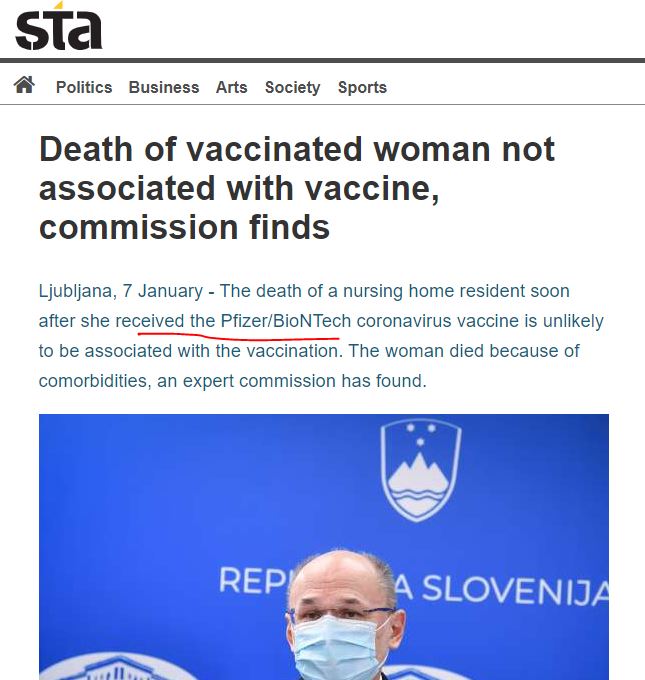 Ο θάνατος μιας γυναίκας που διέμενε σε γηροκομείο αμέσως μετά τη λήψη του εμβολίου Pfizer / BioNTech coronavirus είναι απίθανο να συσχετιστεί με τον εμβολιασμό. Η γυναίκα πέθανε λόγω συννοσηρότητας, σύμφωνα με ειδική επιτροπή αναφέρει το sta.si στις 7 Γενάρη για το θάνατο της Σλοβένας.