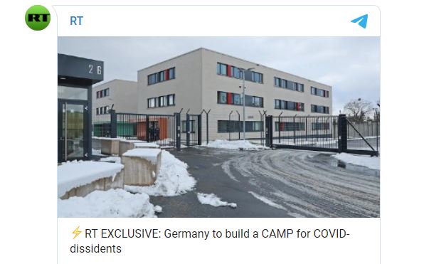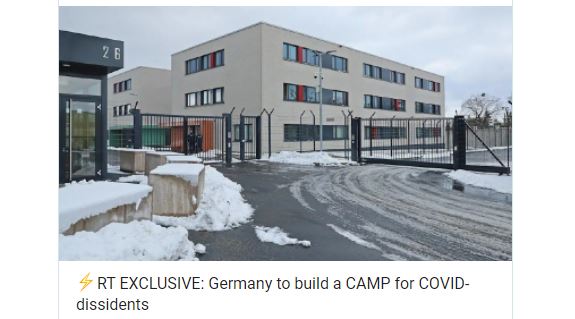 ”Η Γερμανία επιβεβαιώνει στo RT ότι κατασκευάζει ένα CAMP για αντιφρονούντες του COVID. Κρίνεται απαραίτητο να απειληθούν οι παραβάτες καραντίνας με διέλευση από τη φυλακή Covid. Η εγκατάσταση θα εδρεύει στη Δρέσδη.”.. προσθέτει το RT.