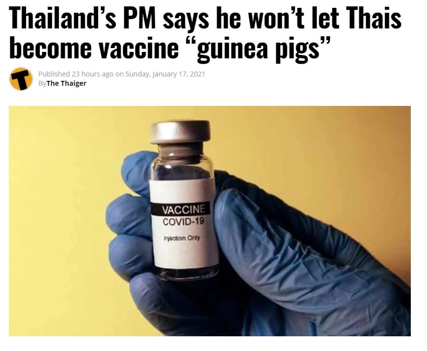 Ο πρωθυπουργός της Ταϊλάνδης είπε ότι δεν θα αφήσει τους Ταϊλανδούς να γίνουν «ινδικά χοιρίδια» για τα εμβόλια σε ανάρτησή του στο Facebook σήμερα, καθώς επισημαίνει αναφορές για σοβαρές αρνητικές παρενέργειες που έχουν υποστεί κάποιοι άνθρωποι αφότου εμβολιάστηκαν κατά Covid-19. Αντ ‘αυτού, ο πρωθυπουργός Prayut Chan-o-cha λέει ότι θα περιμένει περισσότερες πληροφορίες από τους ειδικούς σχετικά με το εάν τέτοιες παρενέργειες αποδόθηκαν αποκλειστικά στο εμβόλιο ή σε άλλους παράγοντες. “Για τους Ταϊλανδούς, αποφάσισα να μην αναλάβω το ρίσκο και να μην σπεύσουν για εμβολιασμό με εμβόλια που δεν έχουν δοκιμαστεί πλήρως και δεν θα αφήσω τους Ταϊλανδούς να γίνουν ινδικά χοιρίδια. . Δεδομένου ότι τα εμβόλια δεν είναι ακόμη διαθέσιμα, επανέλαβε τη σημασία της λήψης προφυλάξεων όπως τη χρήση μάσκας προσώπου κατά την έξοδο από το σπίτι, την άσκηση κοινωνικής απόστασης και την αποχή από συγκεντρώσεις, ιδιαίτερα πολιτικές.