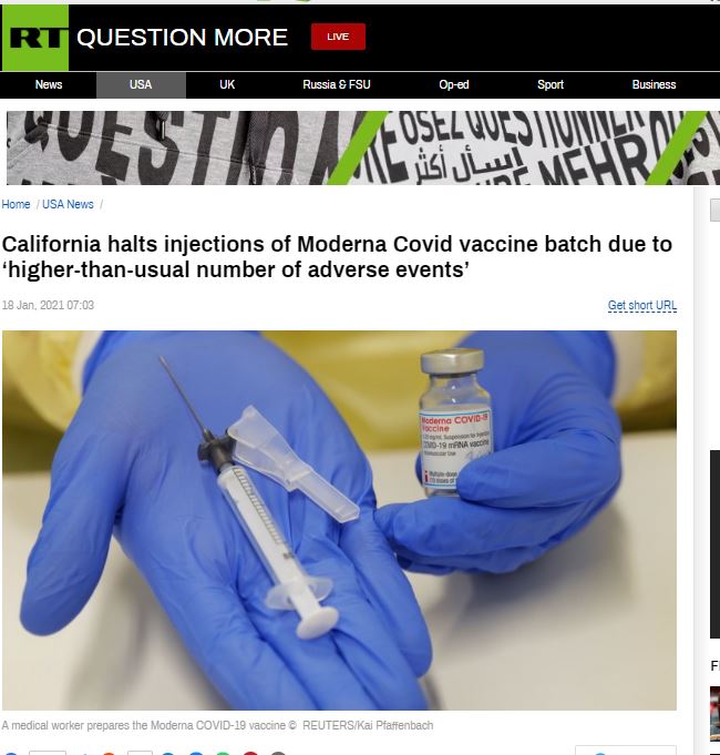 Στις Ηνωμένες Πολιτείες, αξιωματούχοι υγείας της Καλιφόρνιας ζήτησαν από τους προμηθευτές εμβολίων να σταματήσουν να χορηγούν μια παρτίδα Moderna (mRNA) μετά από μια ασυνήθιστα υψηλή ποσότητα ανεπιθύμητων ενεργειών, πιθανώς σχετιζόμενες με αυτό το εμβόλιο. Οι δόσεις της παρτίδας Moderna “041L20A” θεωρούνται ύποπτες ότι προκαλούν “υψηλότερο αριθμό ανεπιθύμητων ενεργειών από το συνηθισμένο” και πρέπει να διατηρηθούν έως ότου μπορεί να διεξαχθεί σωστή έρευνα, δήλωσε το υπουργείο Δημόσιας Υγείας της Καλιφόρνια την Κυριακή.