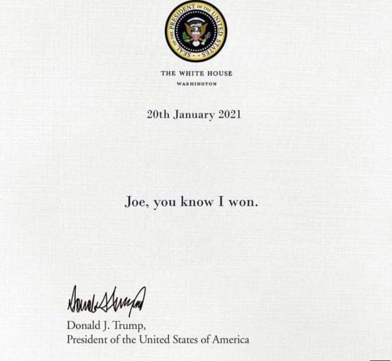 Είναι απίστευτο αν είναι αληθινό…Ο Τραμπ άφησε ένα σημείωμα με ημερομηνία 20.1.21 στο οβάλ γραφείο στον Μπάιντεν όπου του γράφει: ”Joe,you know I won” Joe, εσύ ξέρεις, εγώ νίκησα.Και υπογράφει ως Πρόεδρος των ΗΠΑ.