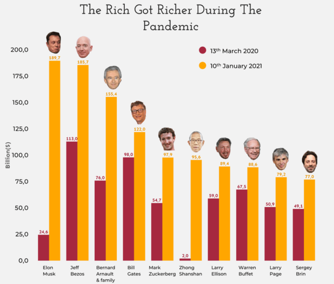 Oxfam: oι 10 πλουσιότεροι άνθρωποι στον κόσμο αύξησαν τον πλούτο τους κατά μισό τρις $ από τον Μάρτιο του 2020, ενώ 200- 500 εκατομμύρια άνθρωποι προστέθηκαν στη φτώχεια…. Υπερκέρδη για Ελίτ από τα lockdown…….
