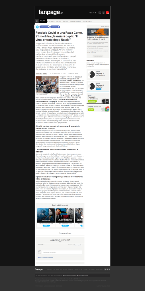 Ο τραγικός αριθμός σε ένα γηροκομείο στο Rebbio, μια πόλη κοντά στο Κόμο, είναι 21 νεκροί και δεκάδες θετικοί στο Covid συμπεριλαμβανομένων των ηλικιωμένων και των εργαζομένων στον τομέα της υγείας. Η RSA, που είχε συμμετάσχει στην εκστρατεία εμβολιασμού,qβρίσκεται μέσω της Varesina και είναι μέρος του Ιδρύματος Ca ‘d’Industria μαζί με τρεις άλλες δομές (δύο RSA και ένα ξενοδοχείο).