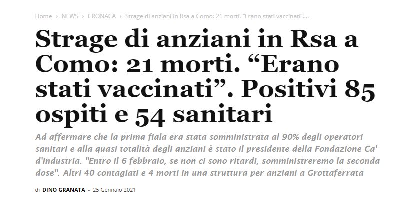 ”Σφαγή των ηλικιωμένων στο RSA στο Como: 21 νεκροί. “Ήταν εμβολιασμένοι” ….” αναφέρει το ιταλικό μέσο secondopianonews.it στις 25/1/21…