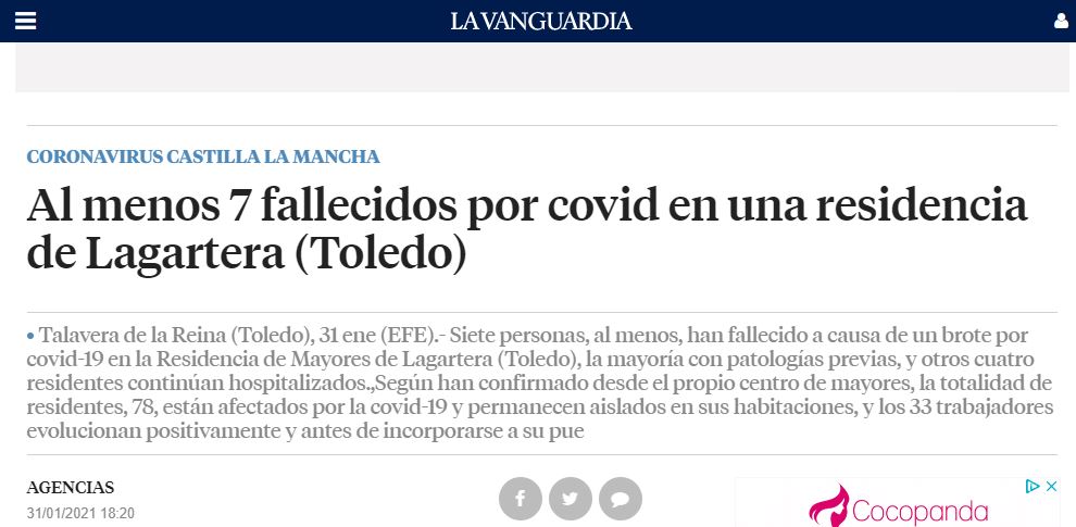 Τουλάχιστον επτά άτομα, έχουν πεθάνει εξαιτίας μιας έξαρσης covid-19 στο γηροκομείο Lagartera για τους ηλικιωμένους (Τολέδο), τα περισσότερα με προηγούμενες παθολογίες και άλλοι 4 τρόφιμοι παραμένουν στο νοσοκομείο. Όπως επιβεβαιώνεται από το ίδιο το ίδρυμα, όλοι οι τρόφιμοι συνολικά 78, πλήττονται από το covid-19 και παραμένουν απομονωμένοι στα δωμάτιά τους, και οι 33 εργαζόμενοι εξελίσσονται θετικά και πριν επανέλθουν στη δουλειά τους πρέπει να παρουσιάσουν αρνητικό PCR.
