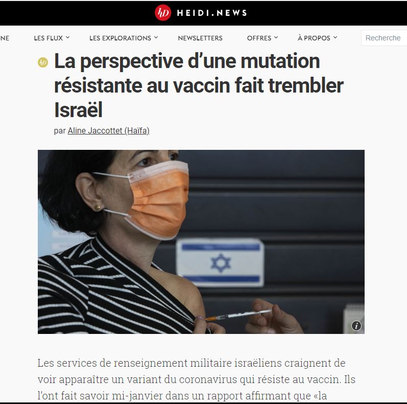 Οι ισραηλινές στρατιωτικές υπηρεσίες πληροφοριών φοβούνται ότι θα εμφανιστεί μια παραλλαγή του κορωνοϊού που θα είναι ανθεκτική στο εμβόλιο. Το γνωστοποίησαν στα μέσα Ιανουαρίου σε μια έκθεση που ισχυρίζεται ότι «η εκστρατεία μαζικού εμβολιασμού που λαμβάνει χώρα ταυτόχρονα με την ενεργή επιδημία μπορεί να ασκήσει εξελικτική πίεση στον ιό και να προκαλέσει μεταλλάξεις».