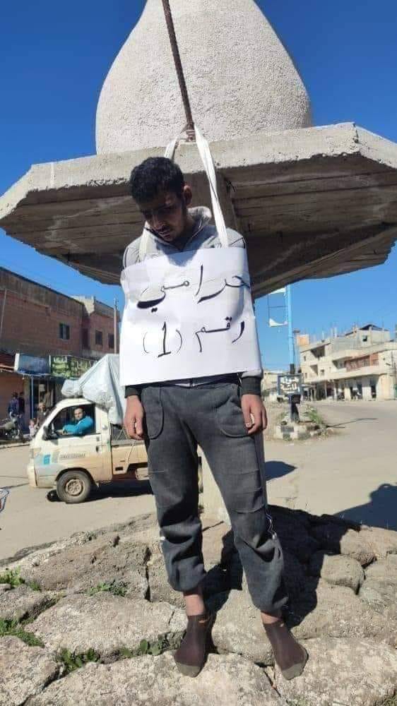 Στη Daraa στη Συρία οι τουρκόφιλοι τρομοκράτες κρέμασαν νεαρό άτομο με την κατηγορία ότι ήταν κλέφτης.. Η σαρία των τζιχαντιστών επανέρχεται !Οι ίδιοι ενεργοποιημένοι θύλακες των τρομοκρατών πραγματοποιούν στοχευμένες επιθέσεις σε στρατιώτες κι αξιωματικούς στην περιοχή που είναι στην επικράτεια των περιοχών που ελέγχει η συριακή κυβέρνηση. Δημόσια κρέμασαν με την αντίστοιχη επιγραφή κατηγορίας στο κυκλικό κόμβο στη Dallah της Ντάραα το νεαρό με την κατηγορία ότι έκλεψε ένα μηχανάκι στη Nawa. Δημόσιος απαγχονισμός ένα ακόμη έγκλημα κατά της ανθρωπότητας…
