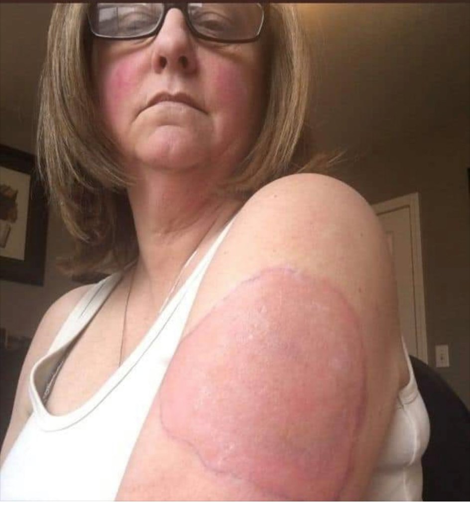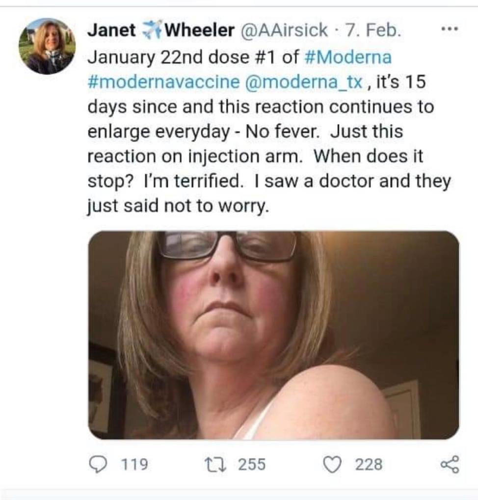 Είναι η Janet Wheeler που γράφει στις 7 Φλεβάρη 2021 στο twitter.”Στις 22 Γενάρη έκανα την 1η δόση του εμβολίου Μοderna. Eίναι αυτή πλέον η 15 η μέρα και η αντίδρασή του συνεχίζει να διευρύνεται καθημερινά. Δεν είμαι εμπύρετη. Ακριβώς αυτή η αντίδραση στο εμβολιασμένο μπράτσο.Πότε θα σταματήσει; Είμαι τρομοκρατημένη. Είδα ένα γιατρό και μου είπαν μην ανησυχείς……”