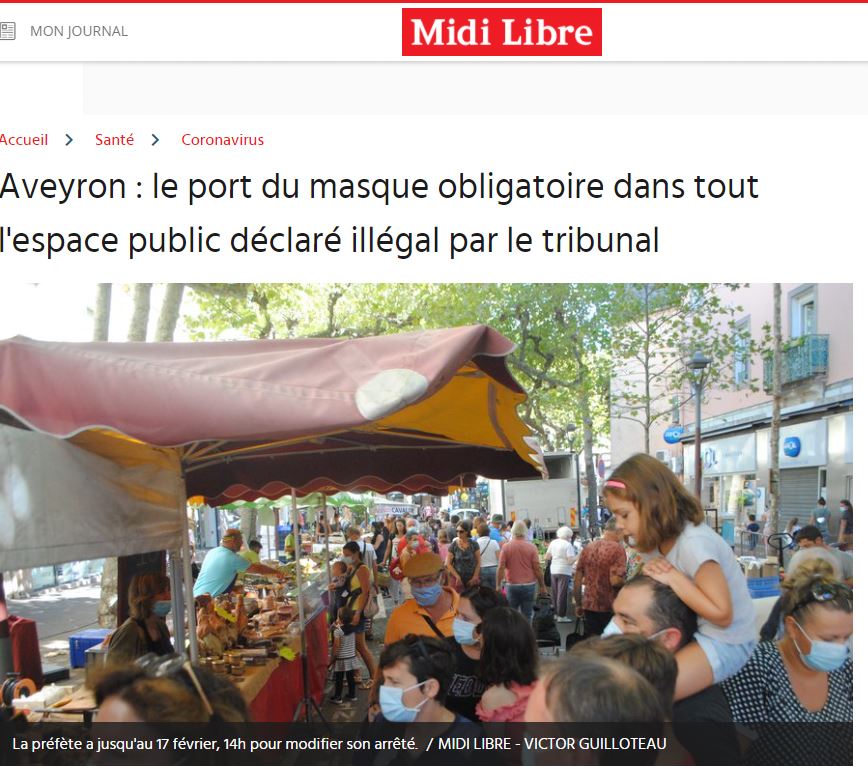 Στη Γαλλία στην Aveyron : η υποχρεωτική χρήση μάσκας σε κάθε δημόσιο χώρο κρίθηκε παράνομη από το δικαστήριο.Η νομάρχης μέχρι τις 17 Φεβρουαρίου δηλ. αύριο οφείλει να τροποποιήσει το διάταγμά της. Δόθηκαν προθεσμία μόλις 14 ώρες για αυτή την τροποποίηση.