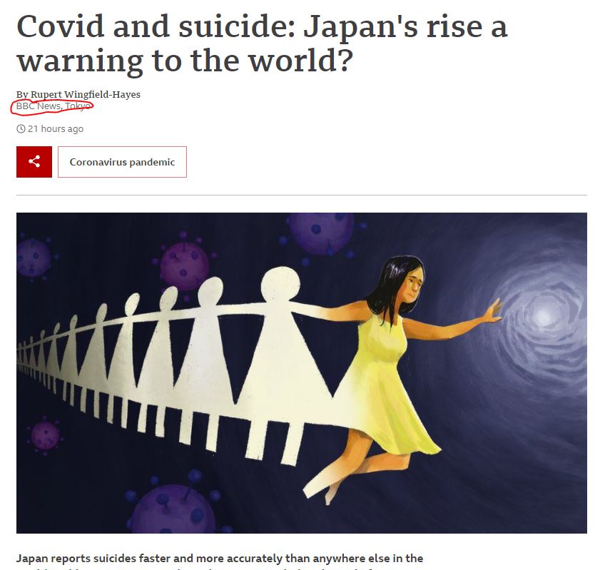 Διαρκές έγκλημα κατά της ανθρωπότητας. Ιαπωνία: λόγω διαχείρισης covid19 το 2020, για α΄φορά σε 11 χρόνια, τα ποσοστά αυτοκτονιών αυξήθηκαν.Τον Οκτώβριο, το ποσοστό αυτοκτονίας γυναικών αυξήθηκε κατά 70%,συγκριτικά με Οκτώβριο’19.Έχει περισσότερες αυτοκτονίες παρά νεκρούς από Coronavirus.