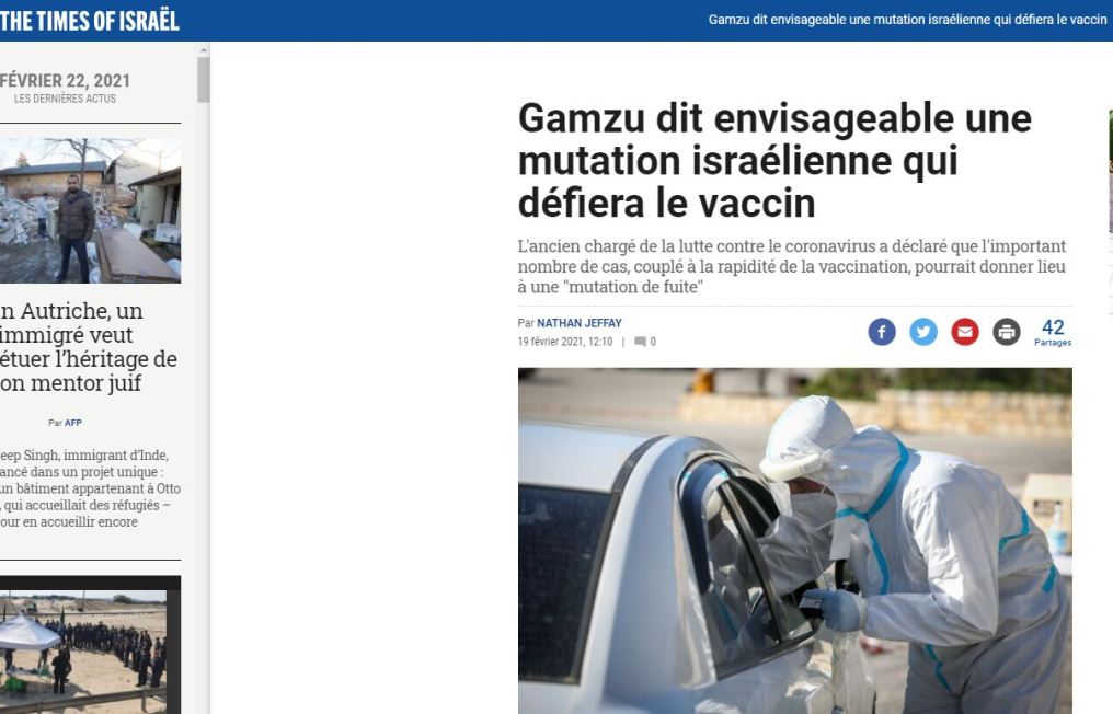 O Καθηγητής Gamzu (Tel Aviv University and Tel-Aviv Sourasky Medical Center) τ. Υπεύθυνος επιφορτισμένος με την μάχη κατά του coronavirus στο Ισραήλ δήλωσε ο σημαντικός αριθμός των κρουσμάτων σε συνδυασμό με την ταχύτητα εμβολιασμού θα μπορούσε να προκαλέσει μια “μετάλλαξη που θα διαφύγει”.