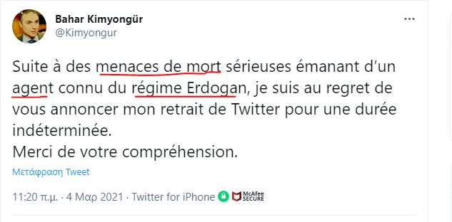 O γνωστός Βελγο-τούρκος ιστορικός-Αρχαιολόγος ακτιβιστής Ανθρωπίνων Δικαιωμάτων τις μειονότητας των Αλεβιτών Bahar Kimyongur κάτοικος Βρυξελλών αναφέρει σήμερα το πρωί 4/3/21 ότι δέχεται απειλές θανάτου από παρακρατικό στοιχείο του καθεστώτος Ερντογάν..”Στη συνέχεια σοβαρών απειλών θανάτου προερχόμενες από γνωστό πράκτορα του καθεστώτος Ερντογάν, λυπάμαι αλλά είμαι αναγκασμένος να σας ανακοινώσω την απόσυρσή μου από το Twitter για μια ακαθόριστη διάρκεια. Ευχαριστώ για την κατανόηση σας”