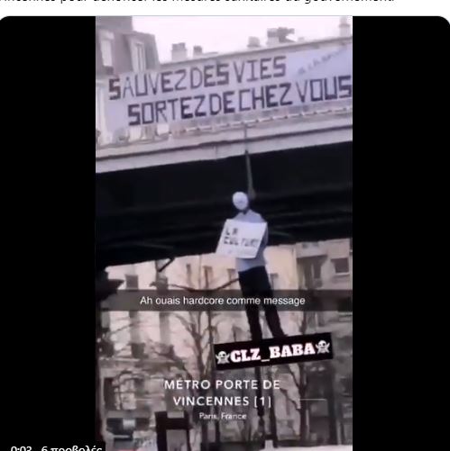 Μια σοκαριστική ακτιβιστική δράση στο Παρίσι σήμερα που δείχνει το μέγεθος του προβλήματος. 3 ανθρώπινα ομοιώματα απαγχονισμένα με τις επιγραφές το καθένα “ο πολιτισμός/κουλτούρα”, “η κοινωνική ζωή” και οι “έμποροι” κρέμονταν σε γέφυρα στην Porte de Vincennes για να καταγγελθούν τα απάνθρωπα μέτρα μίσους της κυβέρνησης που σκοτώνουν με μιντιακό σιγαστήρα.To πιο συγκλονιστικό ήταν το μεγάλο πανό που είχε αναρτηθεί κι έγραφε: ΣΩΣΤΕ ΖΩΕΣ ΒΓΕΙΤΕ ΑΠΟ ΤΑ ΣΠΙΤΙΑ ΣΑΣ”.