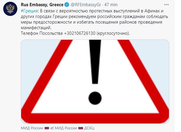 Ταξιδιωτική Οδηγία της Ρώσικης Πρεσβείας στην Αθήνα προς υπηκόους της ν΄αποφεύγονται οι τόποι διαδηλώσεων στις ελληνικές πόλεις!!!” Λόγω της πιθανότητας διαδηλώσεων στην Αθήνα και σε άλλες πόλεις της Ελλάδας, συνιστούμε στους Ρώσους πολίτες να λαμβάνουν προφυλάξεις και να αποφεύγουν να επισκέπτονται περιοχές όπου γίνονται διαδηλώσεις. Ο αριθμός τηλεφώνου της πρεσβείας είναι 2106726130 (24 ώρες το 24ωρο)