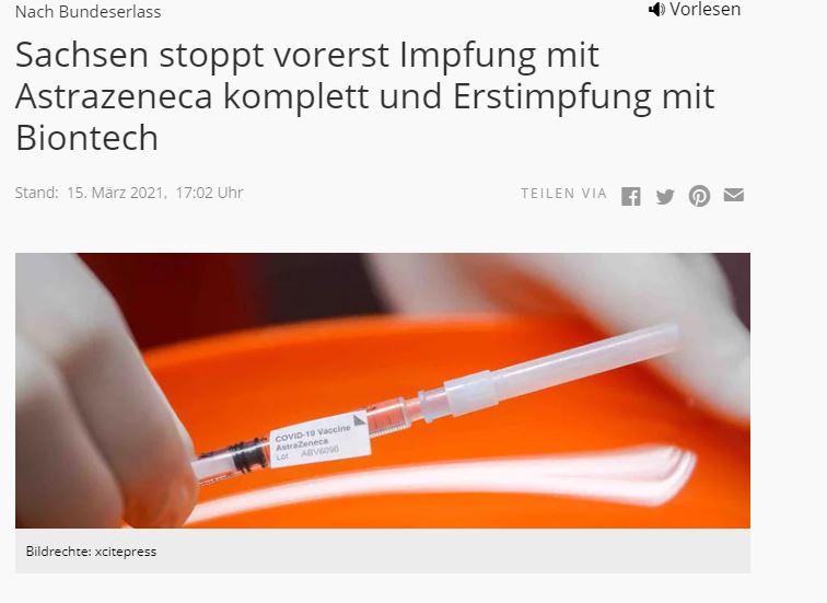 Σύμφωνα με το ομοσπονδιακό διάταγμα, η Σαξονία θα σταματήσει αρχικά τον εμβολιασμό με το Astrazeneca εντελώς και τον αρχικό εμβολιασμό με το Pfizer/Biontech από τις 15 Μαρτίου 2021, 5:02 μ.μ.