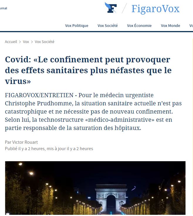 Σε συνέντευξή του στη lefigaro στις 17/3/21 o Γιατρός Επειγοντολόγος Christophe Prudhomme που υπηρετεί στο SAMU 93, και είναι εκπρόσωπος τύπου του Σωματείου Επειγοντολόγων -Association des médecins urgentistes de France (Amuf) τονίζει και προειδοποιεί: «το lockdown μπορεί να προκαλέσει υγειονομικά αποτελέσματα πιο καταστροφικά απ’ ότι ο ιός.»Γι αυτόν η τεχνοδομή «υγειονομικο-διοικητική» είναι εν μέρει υπεύθυνη για τον κορεσμό των νοσοκομείων. (σσ. μήπως κάτι αντίστοιχο συμβαίνει και στην Ελλάδα;)