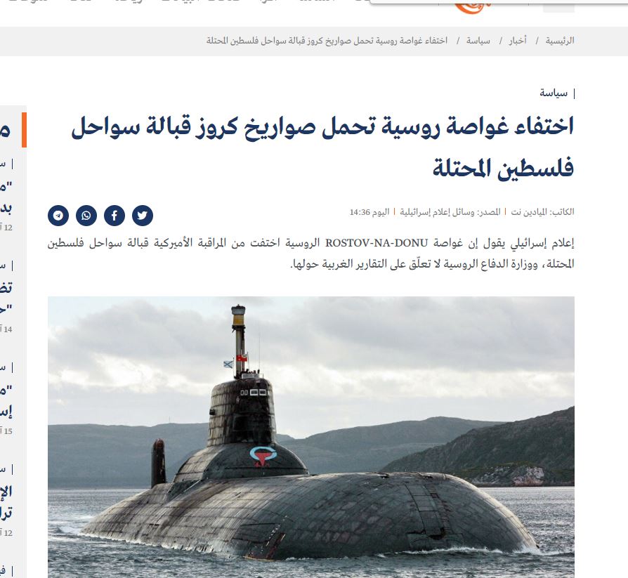Τι αναφέρει το λιβανέζικο μέσο almayadeen: Ο ισραηλινός ιστότοπος “rotter.net” ανέφερε στις 17/3/21, σύμφωνα με ξένη έκθεση, ότι το υποβρύχιο ROSTOV-NA-DONU, το οποίο πίεσε τους Βρετανούς πριν από ένα μήνα, και διέσχισε το Στενό του Γιβραλτάρ πριν από μια εβδομάδα, εξαφανίστηκε χθες, Τετάρτη, από την αμερικανική επιτήρηση στα ανοικτά των ακτών της κατεχόμενης Παλαιστίνης, προσθέτοντας, “Οι αναζητήσεις βρίσκονται σε εξέλιξη. Με αμερικανικά και ισραηλινά πολεμικά πλοία.”