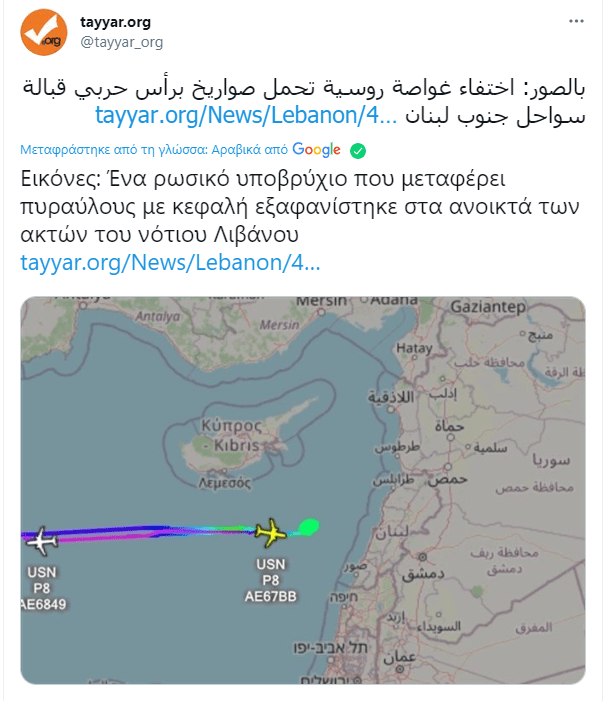 Χάθηκε ρωσικό υποβρύχιο με 4 πυραύλους κρουζ ανοικτά του Λιβάνου και προς τις ακτές του Ισραήλ. Το ρωσικό υποβρύχιο KILO μεταφέρει 4 πυραύλους κρουζ με βάρος κεφαλής έως 500 κιλά. Χάθηκε το στίγμα του στα ανοικτά των ακτών του νότιου Λιβάνου προς τις ακτές του Ισραήλ από την αμερικάνικη πλατφόρμα επιτήρησης, P-8A Poseidon. Οι αναζητήσεις βρίσκονται σε εξέλιξη από πολεμικά πλοία ΗΠΑ και Ισραήλ. H πληροφορία αναφέρεται από το INTELSky που είναι παρατηρητήριο εναέριου χώρου κινήσεων πολεμικών αεροσκαφών κλπ Βουίζουν επίσης ισραηλινά και λιβανέζικα μέσα. Προφανώς μέχρι τώρα δεν υπάρχει κάποια επίσημη ρωσική επιβεβαίωση ή επίσημη ανακοίνωση άλλης πλευράς.