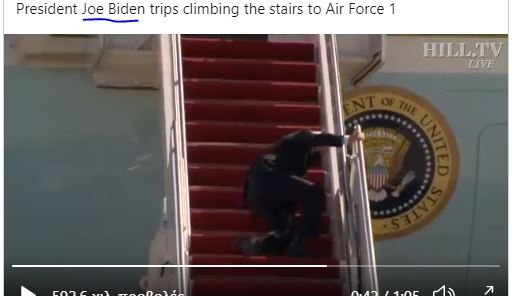 ”Έσπασε” ο Μπάιντεν.. το ποδάρι του! Τριπλή πτώση του Αμερικανού προέδρου κατά την άνοδό του στο αεροσκάφος Air Force One. Γκρεμοτσακίστηκε στη σκάλα ο υπερήλικας ”πλανητάρχης”. Το αξιοπερίεργο είναι ότι κανείς δεν έσπευσε να τον βοηθήσει ενώ όταν τελικά κατάφερε κι έφθασε στην πόρτα του αεροπλάνου έκανε τον καθιερωμένο στρατιωτικό χαιρετισμό στους παριστάμενος μια σκηνή που δεν συνάδει με ότι προηγήθηκε. Επίσης μπήκε στο αεροπλάνο φανερά χωλαίνοντας. Κάτι ήξερε ο Πούτιν που του ευχήθηκε για την υγεία του!!!