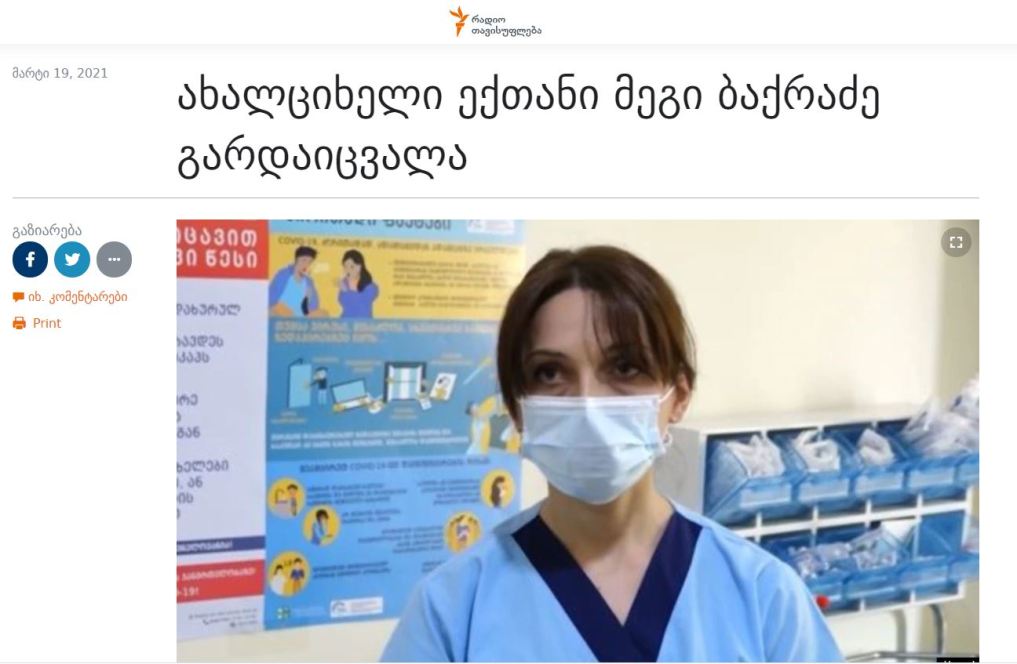 Στις 18 Μαρτίου, μια νεαρή νοσοκόμα εμφάνισε αναφυλακτικό σοκ, μισή ώρα μετά τη λήψη του εμβολίου κοροναϊού, σύμφωνα με προκαταρκτικές εκτιμήσεις. Μεταφέρθηκε από το Akhaltsikhe στην Τιφλίδα.