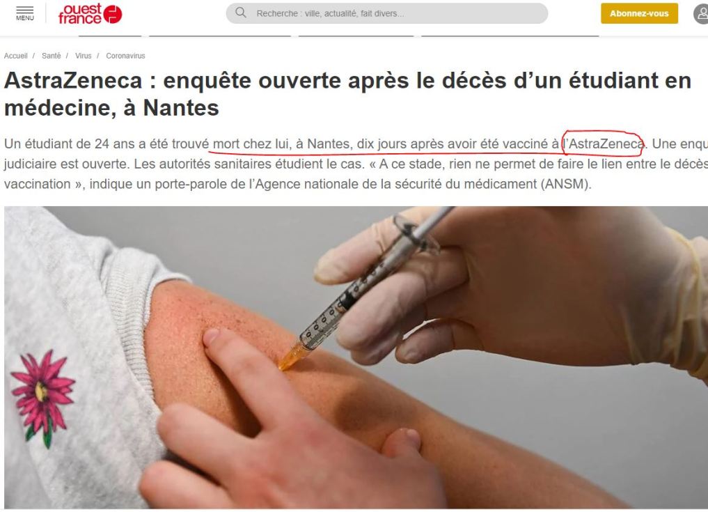 Μέχρι τώρα στη Γαλλία οι φοιτητές πηδούσαν στο κενό από τις φοιτητικές εστίες ή βρίσκονταν κρεμασμένοι στα δωμάτια τους λόγω του κοινωνικού αποκλεισμού τους αφού τα πανεπιστήμια είναι σε παρατεταμένο κλείσιμο. Τώρα τους βρίσκουν νεκρούς μετά τον εμβολιασμό..Ένας 24χρονος φοιτητής βρέθηκε νεκρός σπίτι του 10 μέρες μετά τον εμβολιασμό του με το AstraZeneca . Μια δικαστική έρευνα άνοιξε οι υγειονομικές αρχές μελετούν την περίπτωση.(σσ Δεν λυγίζουν ούτε μπροστά σε πτώματα νεαρών ατόμων) «Σε αυτό το στάδιο τίποτα δεν επιτρέπει να συσχετίσουμε το θάνατο με τον εμβολιασμό », αναφέρει στερεότυπα ο εκπρόσωπος τύπου Εθνικής υπηρεσίας Ασφάλειας των Φαρμάκων (ANSM).( σσ.ίσως είναι η α΄περίπτωση στα ιατρικά χρονικά που εμβολιασμός οποιουδήποτε τύπου δεν συσχετίστηκε με θάνατο, παρ΄ότι στην περίπτωση αυτών των πειραματικών εμβολίων υπήρξαν χιλιάδες θάνατοι κάποιοι κι ακαριαίοι)