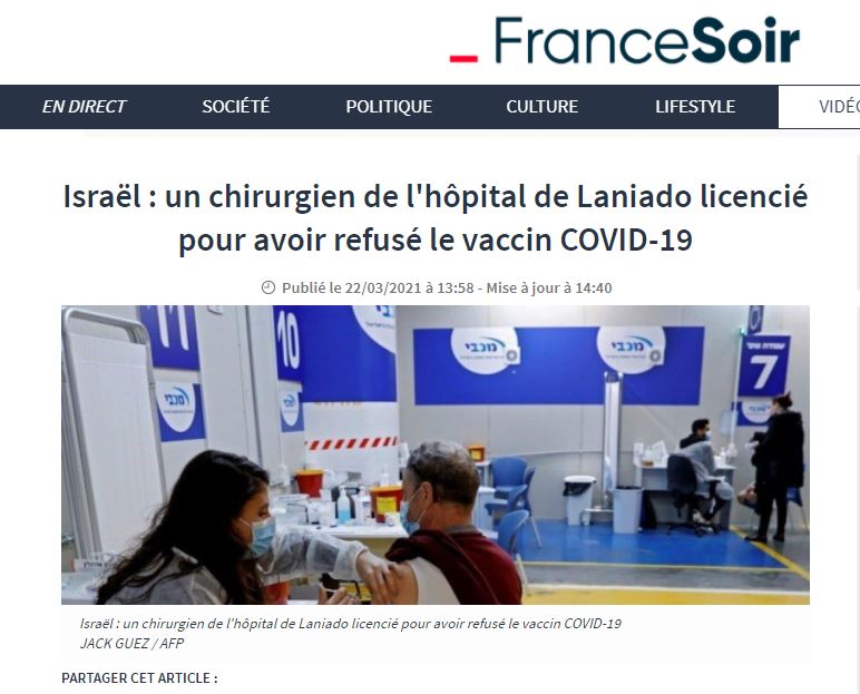 Συνέχισε: « Ο κορονοφασισμός -coronafascisme ξέσπασε στον μικρό γιατρό και στα μικρά άτομα. Χαίρομαι που καρατομήθηκα μετά από 14 χρόνια υπηρεσίας ως Επικεφαλής Χειρουργικής Χειρός στο Νοσοκομείο Laniado (μόνο ενάμιση χρόνο). Ίσως θα βρω δουλειά στο τμήμα COVID. ” FranceSoir 22/3/21