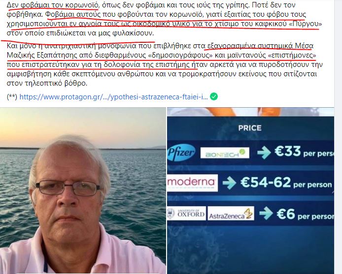 Άκης Τσελέντης (Διευθυντής του Γεωδυναμικού Ινστιτούτου του Εθνικού Αστεροσκοπείου Αθηνών, Διευθυντής του Εθνικού Κέντρου Τσουνάμι και Καθηγητής Σεισμολογίας στο Πανεπιστήμιο Αθηνών) : ”Δεν φοβάμαι τον κορωνοϊό, όπως δεν φοβάμαι και τους ιούς της γρίπης. Ποτέ δεν τον φοβήθηκα. Φοβάμαι αυτούς που φοβούνται τον κορωνοϊό, γιατί εξαιτίας του φόβου τους χρησιμοποιούνται εν αγνοία τους ως οικοδομικό υλικό για το χτίσιμο του καφκικού «Πύργου» στον οποίο επιδιώκεται να μας φυλακίσουν.Και μόνο η ανατριχιαστική μονοφωνία που επιβλήθηκε στα εξαγορασμένα συστημικά Μέσα Μαζικής Εξαπάτησης από διεφθαρμένους «δημοσιογράφους» και μαϊντανούς «επιστήμονες» που επιστρατεύτηκαν για τη δολοφονία της επιστήμης ήταν αρκετά για να πυροδοτήσουν την αμφισβήτηση κάθε σκεπτόμενου ανθρώπου και να τρομοκρατήσουν εκείνους που σιτίζονται στον τηλεοπτικό βόθρο.”