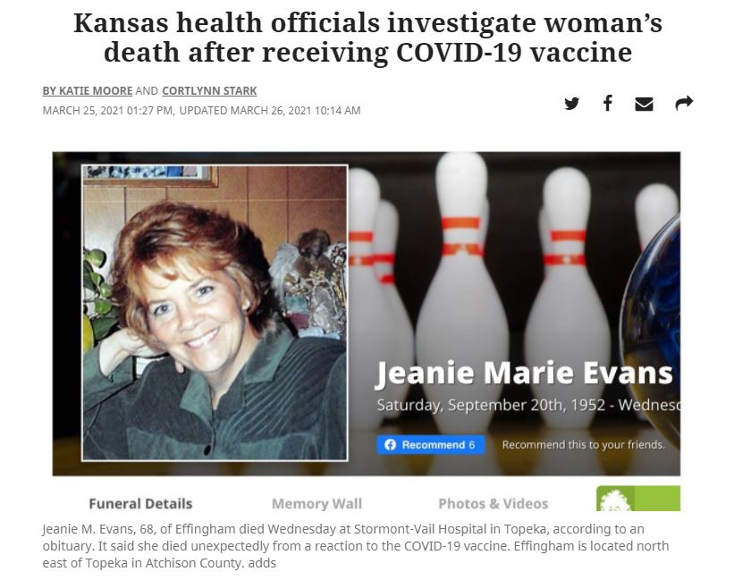 Οι Υγειονομικές Αρχές του Kansas ερευνούν για το θάνατο μιας γυναίκας που είχε μια αλλεργική αντίδραση αφότου εμβολιάστηκε για covid19. Η αιτία θανάτου δεν έχει καθοριστεί. Η 68χρονη Jeanie M Evans από το Effingham όπου ήταν και δημοτικός σύμβουλος πέθανε την Τετάρτη στο νοσοκομείο Stormont Vail de Topeka σύμφωνα με ανακοίνωση νεκρολογίας.Πέθανε με τρόπο μη αναμενόμενο μετά από αντίδραση στο εμβόλιο. ”Καθώς η έρευνα δεν τελείωσε είναι πρώιμο ν΄αποδώσουμε μια ειδική αιτία στο θάνατο” δήλωσε η Kristi Zears εκπρόσωπος τύπου του KDHE σ΄ανακοινωθέν.Σύμφωνα με το KDHE η γυναίκα εμβολιάστηκε στην κομητεία του Jefferson κι η τοπική υπηρεσία υγείας ακολούθησε όλες τις οδηγίες του CDC.Δεν διευκρίνισε ποιό ήταν το εμβόλιο. Στο διάστημα που ακολούθησε τον εμβολιασμό η γυναίκα αισθάνθηκε μια αναφυλαξία και πήγε στο νοσοκομείο όπου και πέθανε. η τοπική υγειονομική αρχή δήλωσε το περιστατικό στο Vaccine Adverse Event Reporting System ανέφερε το KDHE.
