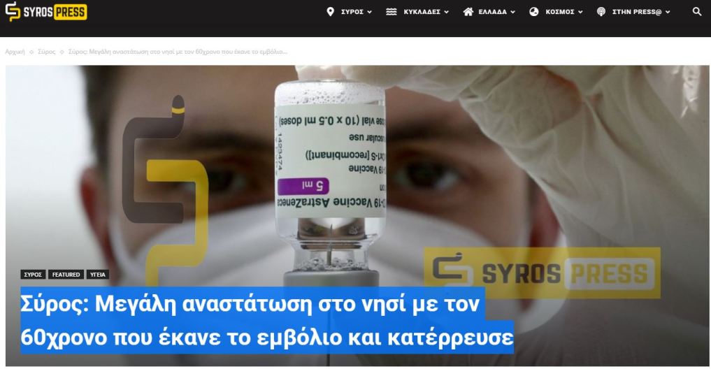 Grèce: Un homme de 60 ans a subi une thrombose après avoir été vacciné avec le vaccin d’ AstraZeneca. Sur l’île de Syros en Grèce, un homme de 60 ans s’est effondré après avoir reçu le vaccin AstraZeneca . Lorsqu’ il est arrivé à son domicile, il a dû être transporté d’urgence à l’hôpital général de Syros et ensuite à un l’hôpital de la capitale grecque, Athènes (26/03/2021). Les médecins ont diagnostiqué un accident vasculaire cérébral ischémique grave, causé par des caillots sanguins.