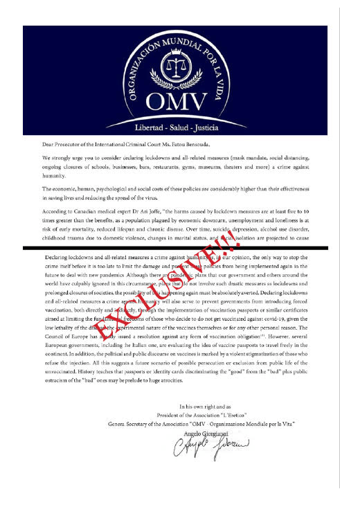 “Σας ζητάμε εντόνως να εξετάσετε το ενδεχόμενο να δηλώσετε τα lockdown και όλα τα σχετικά μέτρα (ένταλμα μάσκας, κοινωνική απόσταση, κλείσιμο σχολείων, επιχειρήσεων, μπαρ, εστιατoρίων, γυμναστηρίων, μουσείων, θεάτρων και άλλων) ως έγκλημα κατά της ανθρωπότητας. Το οικονομικό, ανθρώπινο, ψυχολογικό και κοινωνικό κόστος αυτών των πολιτικών είναι σημαντικά υψηλότερο από την αποτελεσματικότητά τους στη διάσωση ζωών και τη μείωση της εξάπλωσης του ιού », έγραψε στην προσφυγή στο Διεθνές Δικαστήριο της Χάγης ο Δρ Giorgianni, πολιτικός και δικαστής της Σικελίας, ως Γενικός Γραμματέας του Παγκόσμιου Οργανισμού Ζωής….