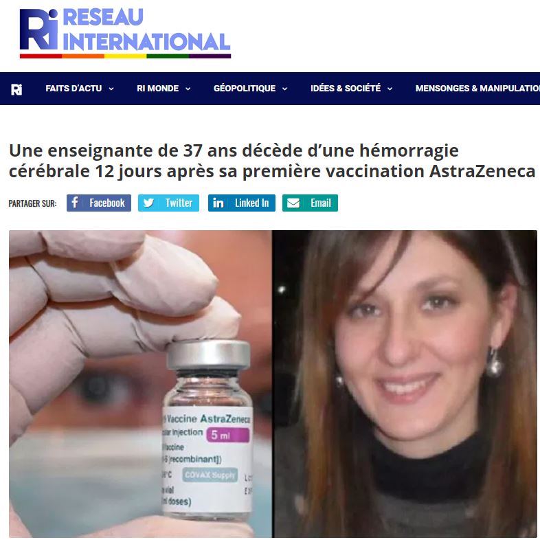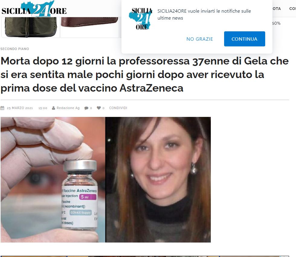 Η εκπαιδευτικός, μετά τη χορήγηση του εμβολίου AstraZeneca, νοσηλεύθηκε σε σοβαρή κατάσταση στο νοσοκομείο Sant’Elia de Caltanissetta,λόγω μιας εγκεφαλικής αιμορραγίας μέχρι που δηλώθηκε σε καθεστώς εγκεφαλικού θανάτου.reseauinternational 30.3.21, .sicilia24h