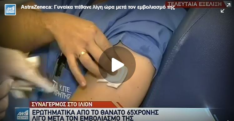 Μαύρο σερί: μετά τον Οδοντίατρο πέθανε και 65χρονη μισή ώρα αφότου εμβολιάστηκε με AstraZeneca!!!Μετά το θάνατο του Οδοντιάτρου μέσα στην ίδια μέρα μετά τον εμβολιασμό τπυ το Σάββατο σήμερα Τρίτη μια 65χρονη πέθανε μόλις μισή ώρα αφότου εμβολιάστηκε με AstraZeneca στο Ίλιον στην Αθήνα. ”Συναγερμός έχει σημάνει στις υγειονομικές Αρχές ύστερα από τον θάνατο μιας 65χρόνης γυναίκας, μισή ώρα μετά το εμβόλιο κατά του κορωνοϊού, που έκανε στο Κέντρο Υγείας στο Ίλιον.Είχε ραντεβού για εμβολιασμό …..και καρτέρι με το θάνατο…Ένας περαστικός πήγε στο ΚΥ και είπε πως μια γυναίκα χρειαζόταν βοήθεια…