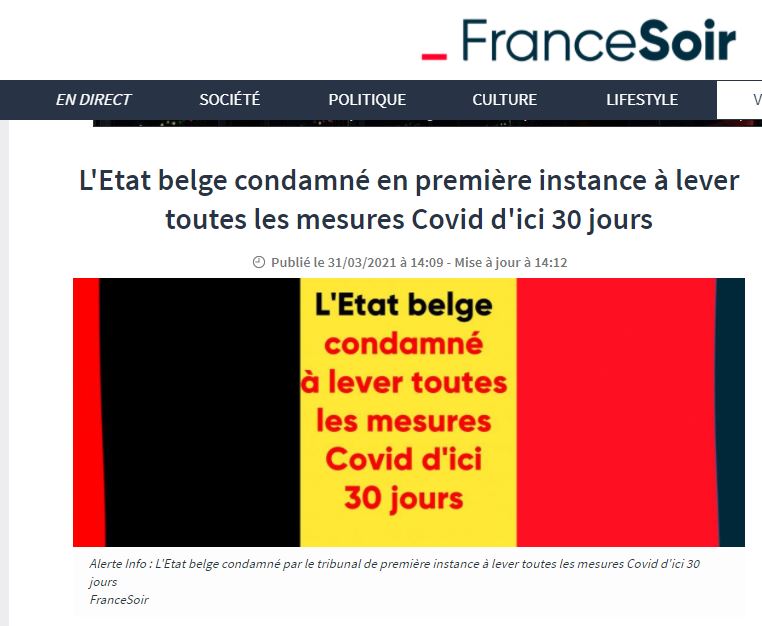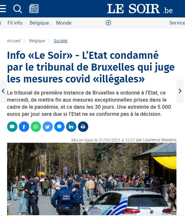Το βελγικό κράτος καταδικάστηκε από το Πρωτοδικείο να άρει όλα τα μέτρα Covid εντός 30 ημερών. Πρόκειται για μια ιστορική απόφαση μεγάλης ανατροπής που προοιωνίζει διεθνείς εξελίξεις. Δημιουργεί ισχυρή νομολογία καθώς και το σκεπτικό της απόφασης είναι καταπέλτης αφού προβλέπει ότι το βέλγικο κράτος πρέπει ”να λάβει όλα τα κατάλληλα μέτρα για να θέσει τέρμα στην κατάσταση της εμφανούς παρανομίας που απορρέει από τα μέτρα περιορισμού των θεμελιωδών δικαιωμάτων και ελευθεριών που αναγνωρίζονται από το Σύνταγμα».