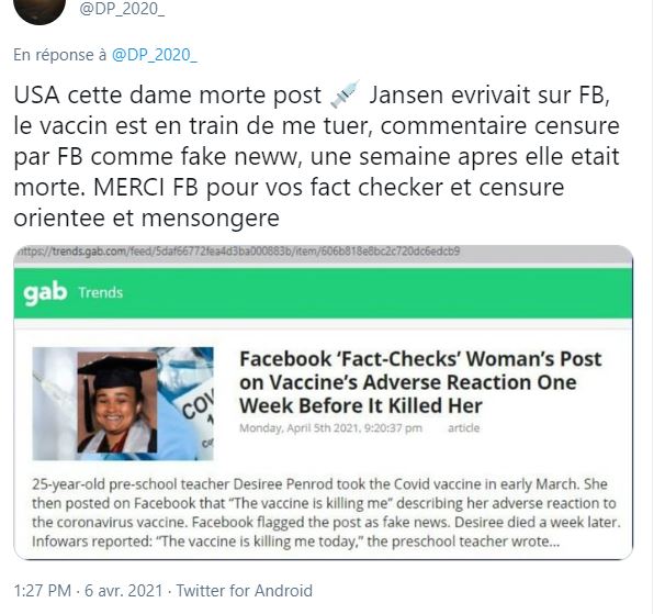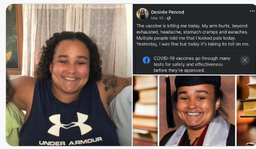 Η Desirée Penrod έγραψε στο Facebook ότι έλαβε τη «δόση Janssen» στις 9 Μαρτίου ή γύρω στις 9 Μαρτίου. Η Janssen Pharmaceuticals είναι το Φαρμακευτικό Τμήμα της Johnson & Johnson και ανέπτυξε το ιογενές εμβόλιο JNJ-78436735. Διατίθεται στο εμπόριο ως εμβόλιο μίας δόσης. Η 25χρονη εκπαιδευτικός είπε ότι δεν αισθάνθηκε καμία αρνητική επίδραση την πρώτη ημέρα του εμβολιασμού. Αλλά στις 11 Μαρτίου έγραψε στον λογαριασμό της στο fb ότι «το εμβόλιο με σκοτώνει σήμερα».