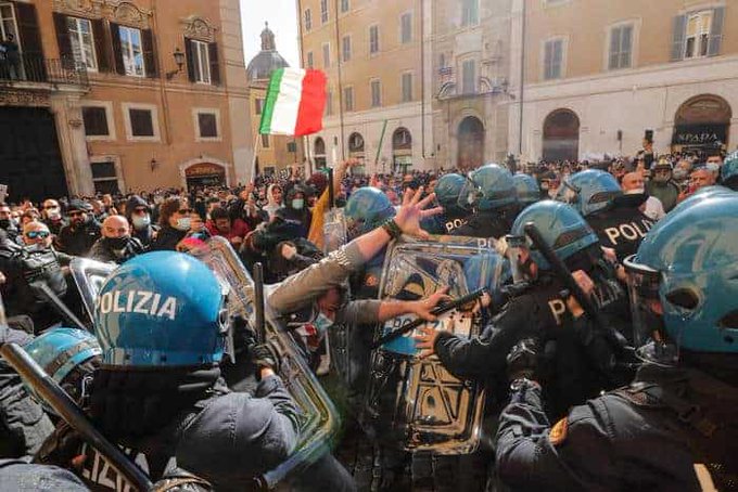 Ξύπνησε η λαϊκή Αίτνα στην Ιταλία, ξεχείλισε η οργή κατά του Mario Dragon που δεν σεβάστηκε την νωπή ιστορία της χώρας του και προχώρησε μόνος αυτός από όλη την Ευρώπη στο απονενοημένο άλμα του Εμπεδοκλή …..και έκανε πραγματικότητα υποχρεωτικό το ναζιστικό υποχρεωτικό εμβολιασμό και έκλεισε από τώρα θέση στη νέα Νυρεμβέργη….. Χιλιάδες Ιταλοί και κυρίως άνθρωποι που δουλεύουν στην εστίαση και στο λιανεμπόριο κατέκλυσαν μεγάλες πόλεις της Ιταλίας σε αντικυβερνητικές διαδηλώσεις για να διαμαρτυρηθούν για την παράταση του lockdown..Την ώρα που ο μεγαλοτραπεζίτης πήγε για αποικιοκρατικού τύπου επίσκεψη κι αφαίμαξη πλουτοπαραγωγικών πηγών στην Αφρική στην πρώην αποικία του στη Λιβύη τρίζει η καρέκλα του αρχιβασανιστή του υγειονομικού σώματος που κάποιοι στην Ελλάδα τον έκαναν αφίσα δημοκρατίας και θέλουν να τον μιμηθούν*.…Συγκρούσεις έξω από το Κοινοβούλιο στη Ρώμη που οι διαδηλωτές επιχείρησαν να σπάσουν τον αστυνομικό κλοιό. Διαδηλώσεις στο Μιλάνο στο Τορίνο στη Γένοβα στη Νάπολη κι σε άλλες πόλεις…..Πήρε στην κυριολεξία φωτιά η Piazza Montecitorio.