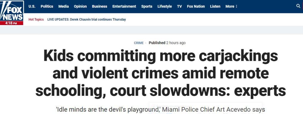 “Ξέρετε, τα αδρανή μυαλά είναι η παιδική χαρά του διαβόλου. Και πολλά από αυτά τα παιδιά, είναι αδρανή εδώ και ενάμιση χρόνο τώρα χωρίς να πηγαίνουν στο σχολείο. Και αυτό ήταν ένα μεγάλο πρόβλημα”, δήλωσε ο Αρχηγός της Αστυνομίας του Μαϊάμι Art Acevedo στo Fox Νews την Τετάρτη. Ο Acevedo υπηρετεί επίσης ως πρόεδρος της Ένωσης Αρχηγών Μεγάλων Πόλεων και ήταν προηγουμένως επικεφαλής του Αστυνομικού Τμήματος του Χιούστον.